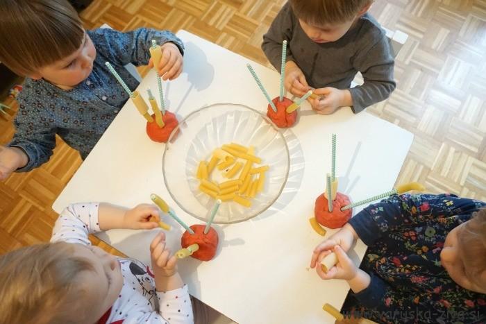 Otrokom sem ponudila zanimivo in zelo enostavno aktivnost iz sestavin, ki jih imamo doma čisto vsi. Domači plastelin (moka, sol, voda, olje) sem uporabila od prejšnje aktivnosti, vanj sem zapičila nekaj slamic in zraven ponudila ravne makarone, katere so otroci natikali na slamice. Aktivnost jih je zelo zaposlila in so se pri njej dolgo zadržali, ko pa so se je naveličali, smo skupaj ustvarili še nekaj umetnin iz danih materialov.