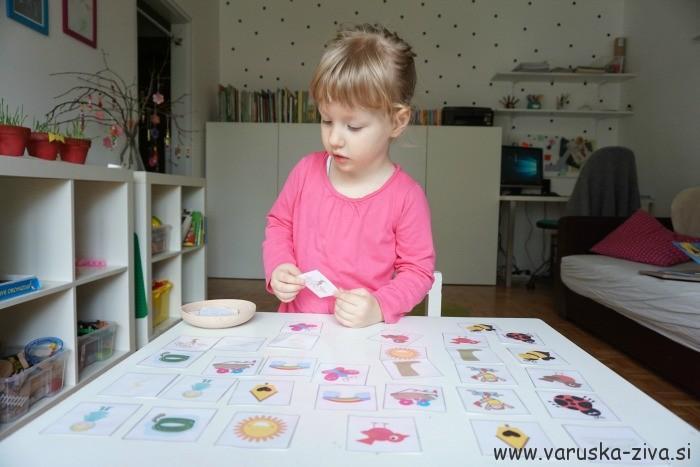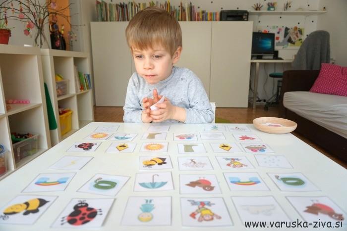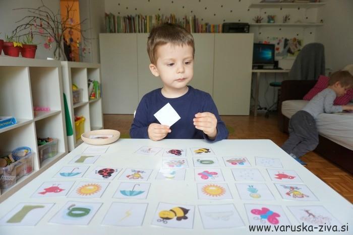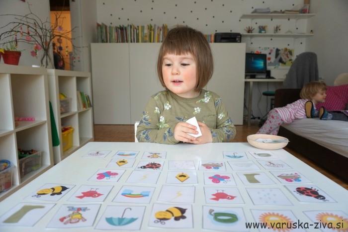 Otrokom se pripravila pomladne kartice, poišči par. Tokrat so morali poiskati kar 15 parov. Mislila sem, da bo to za njih kar precejšen izziv, vendar so jih vsi poiskali brez težav. Pri starejših otrokih kartice le obrnete in tako igrate spomin.