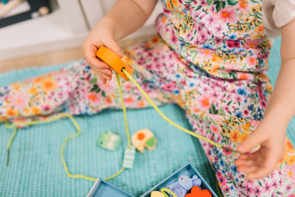 • Pri natikanju oziroma šivanju otrok uri finomotorične spretnosti, saj igrača od otrok zahteva spretno manipulacijo s pristi (vrvica je tanka, delčki so različnih oblik). Da je pri natikanju lahko uspešen, mora usvojiti pincetni prijem, ki mu pomaga, da z vrvico lažje zadene luknjo v figurici.
