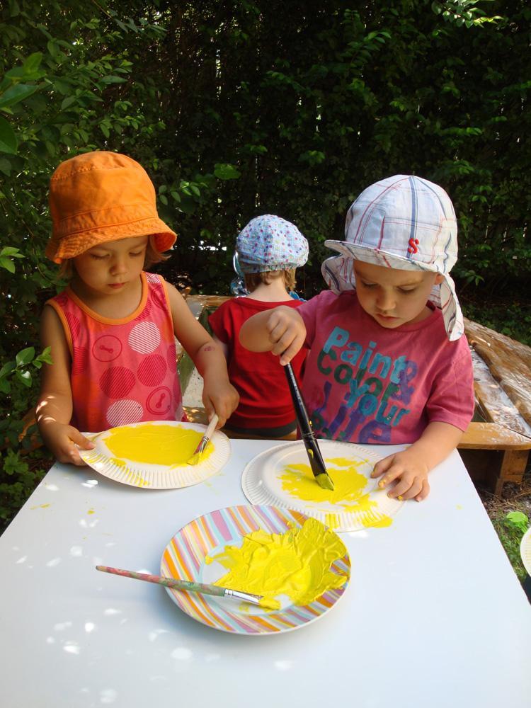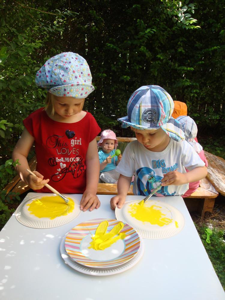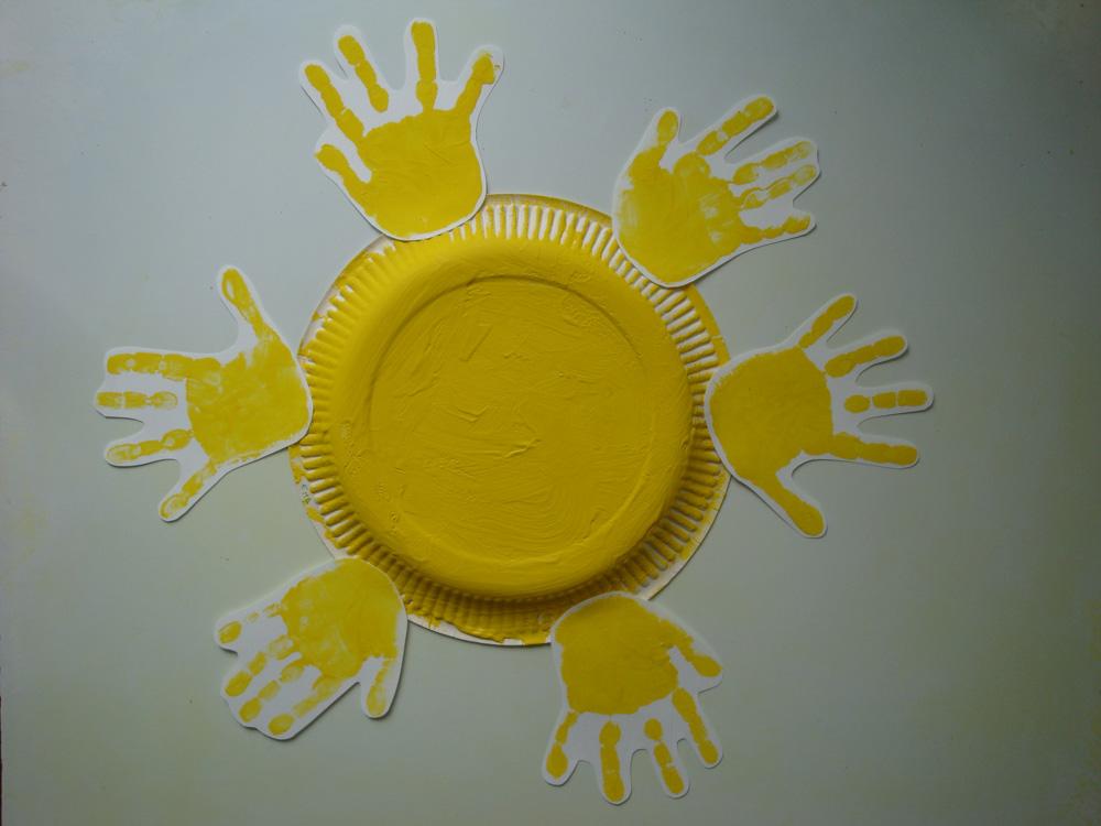 Danes smo naredili sončke iz papirnatih krožnikov. Najprej smo odtisnili rokice, potem pa sem otrokom ponudila še rumeno tempero in čopič, da so pobarvali krožnik. Dejavnost res ni kaj pretirano ustvarjalna je pa lep okras in spomin na naše majhne rokice.