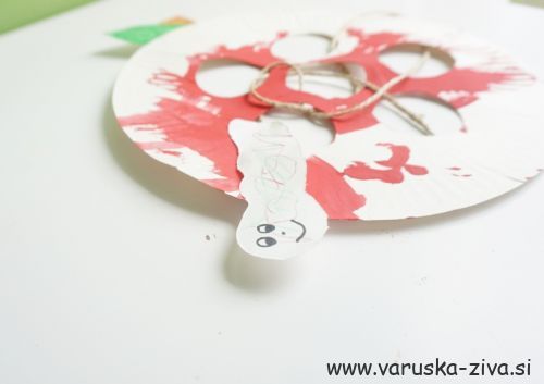 Poskušali smo tiskati z jabolki pa nas niso preveč zanimala zato smo slikali kar z prstki 🙂 jabolko pa je bilo bolj za okras 😀