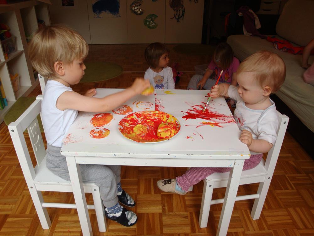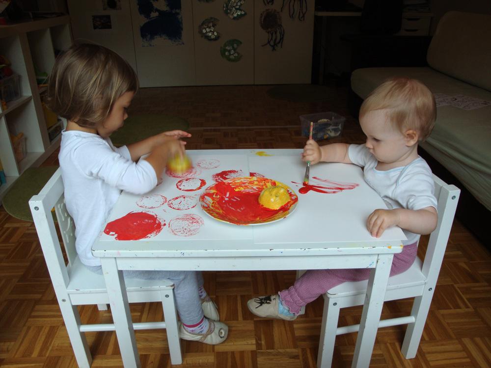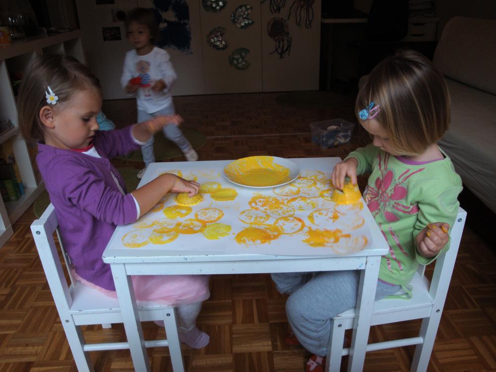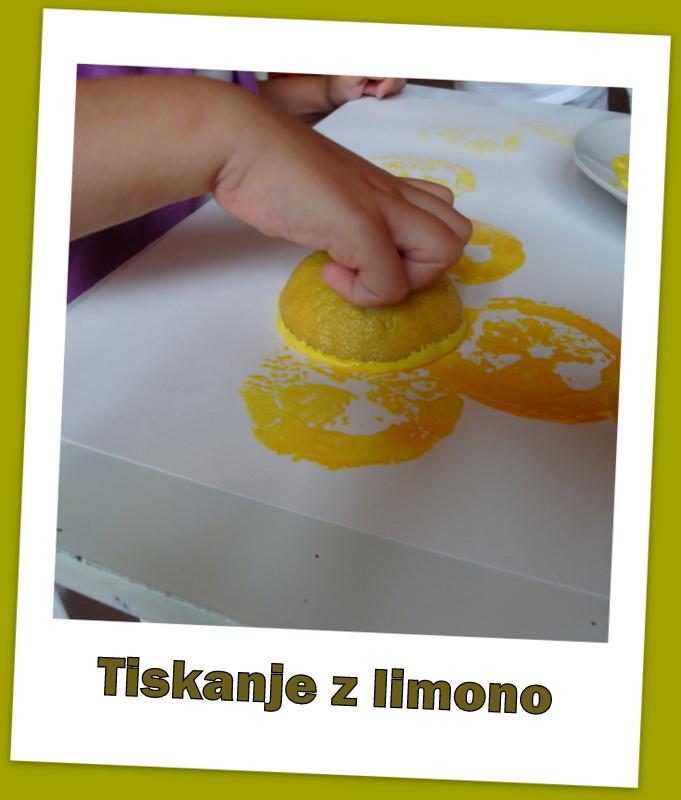 Danes smo tiskali z limono. Limono sem prerezala na pol, na vrhu sem naredila ročaje, da so otroci limono lažje prijeli. Ponudila sem jim tempero v katero so pomakali limono in z njo tiskali. Iz potiskanih listov lahko izdelate čestitke, manjše slikice ali ovijalni papir.