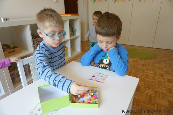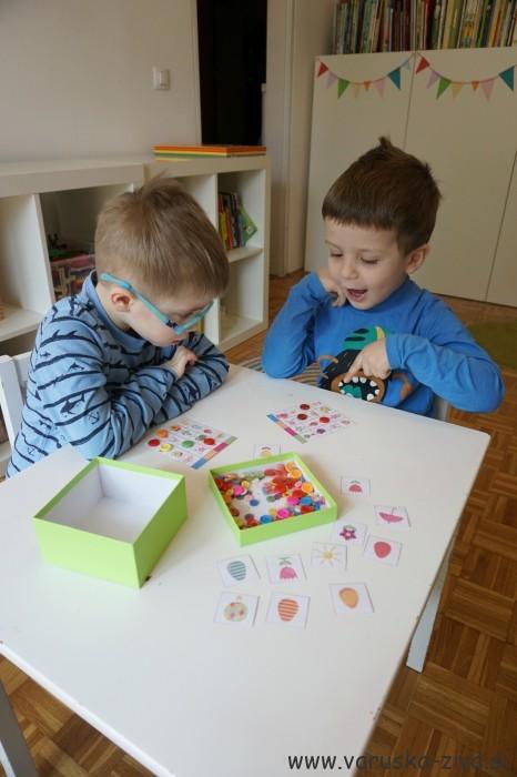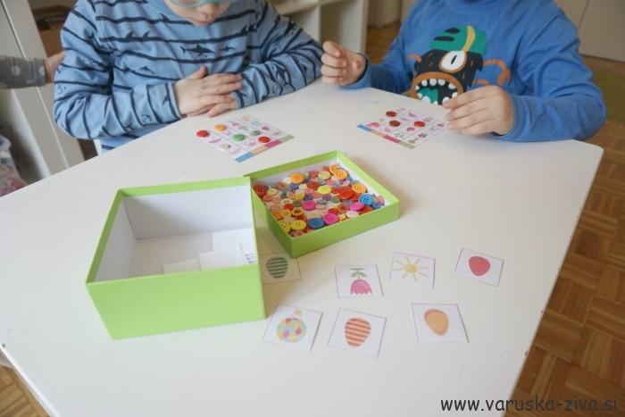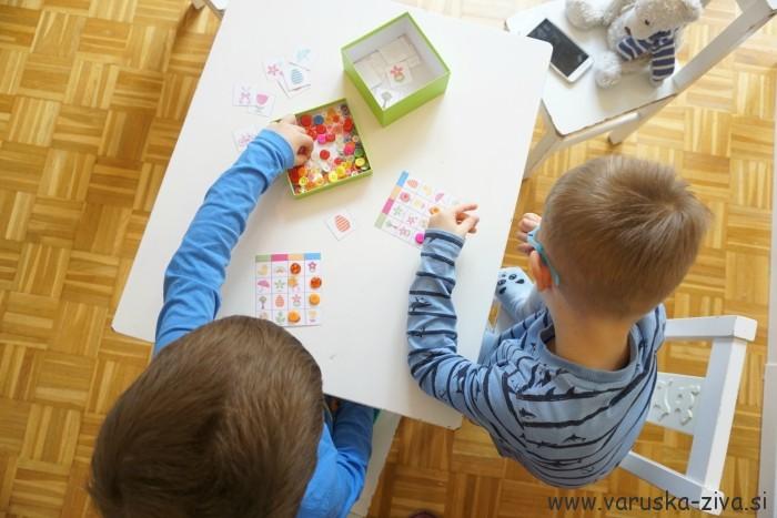 Fanta sta si najprej izbrala vsak svojo kartico na katerih so različne slike. Samostojne kartice, ki sem jih žrebala jaz, pa lahko položite na mizo ali jih zložite v škatlico iz katere kartico potem izvlečete. Izžrebano sliko sta nato fanta poiskala na svoji kartici in jo pokrila z gumbom. Zmagovalec je bil tisti, ki je kratico zapolnil prej.