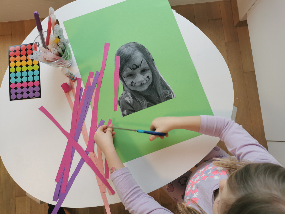 Najprej natisnite in izrežite otrokovo fotografijo, jaz sem se odločila za tisk v črno beli, saj tako fotografija ob ostalem barvnem papirju še bolj zaživi. Nato pa se lotite izdelave različnih zabavnih elementov iz barvnega papirja. Iz papirja lahko izrežete lase, kapice, kravate… Otroka čim bolj prepustite njegovi domišljiji in ustvarjalnim željam.
