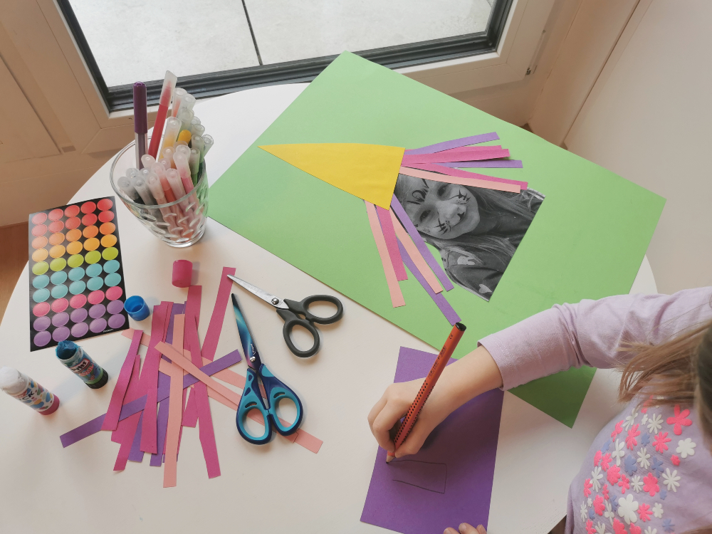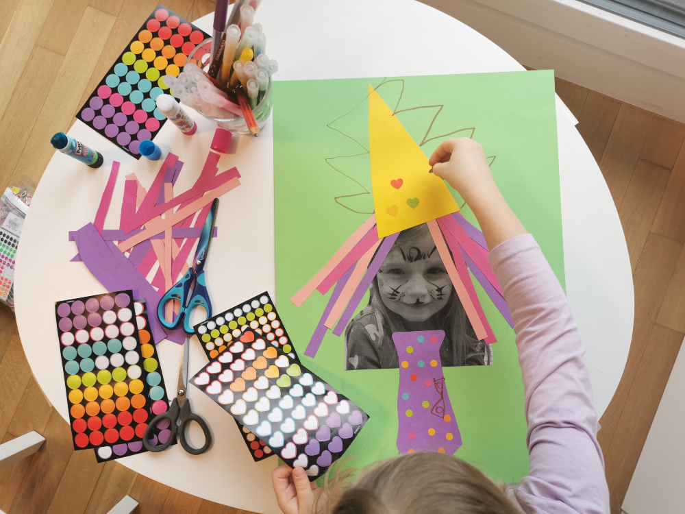 Kako narediti čudovit in smešen pustni kolaž? Nič lažjega, potrebujete le natisnjeno otrokovo fotografijo ter nekaj barvnega kolaž papirja, nalepk in domišljije!